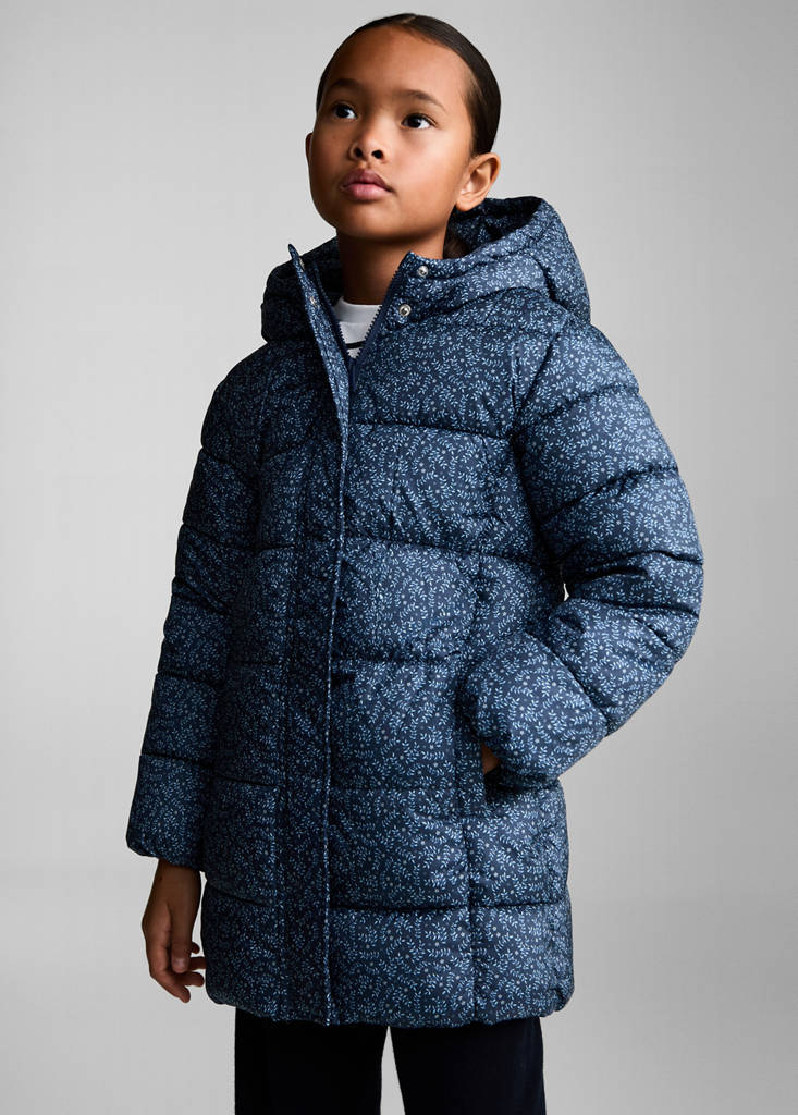 Quilted design. Straight design. Floral print. Long design. High neck. Long sleeves. Two side pockets. Inner polar fleece lining. Front zipper closure. Label for personal data