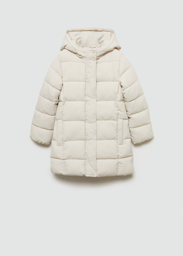 Quilted design. Straight design. Long design. Hood. High neck. Long sleeves. Two front pockets. Zip and button fastening
