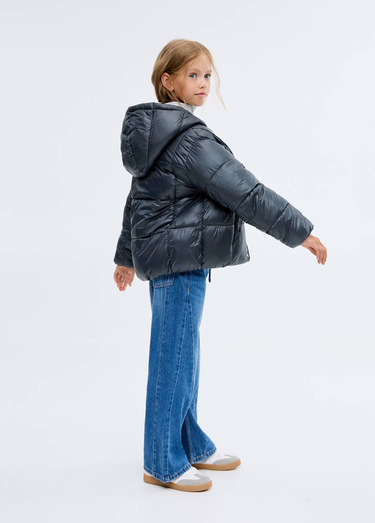Quilted fabric. Polyester fabric. Straight design. With hood. Long sleeves. Button closure. Two side pockets. Two-tone