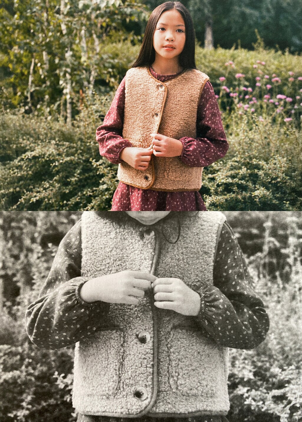 Sherpa fabric. Straight design. Vest design. Round Neck. Sleeveless. Front button closure. Two front welt pockets.