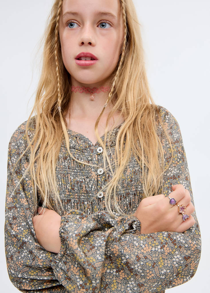 Fluid fabric. Viscose fabric. A-line design. Short design. Round neck. Front button closure. Gathered detail. Honeycomb pattern. Long sleeves with ribbed trims. Ruched waist panel