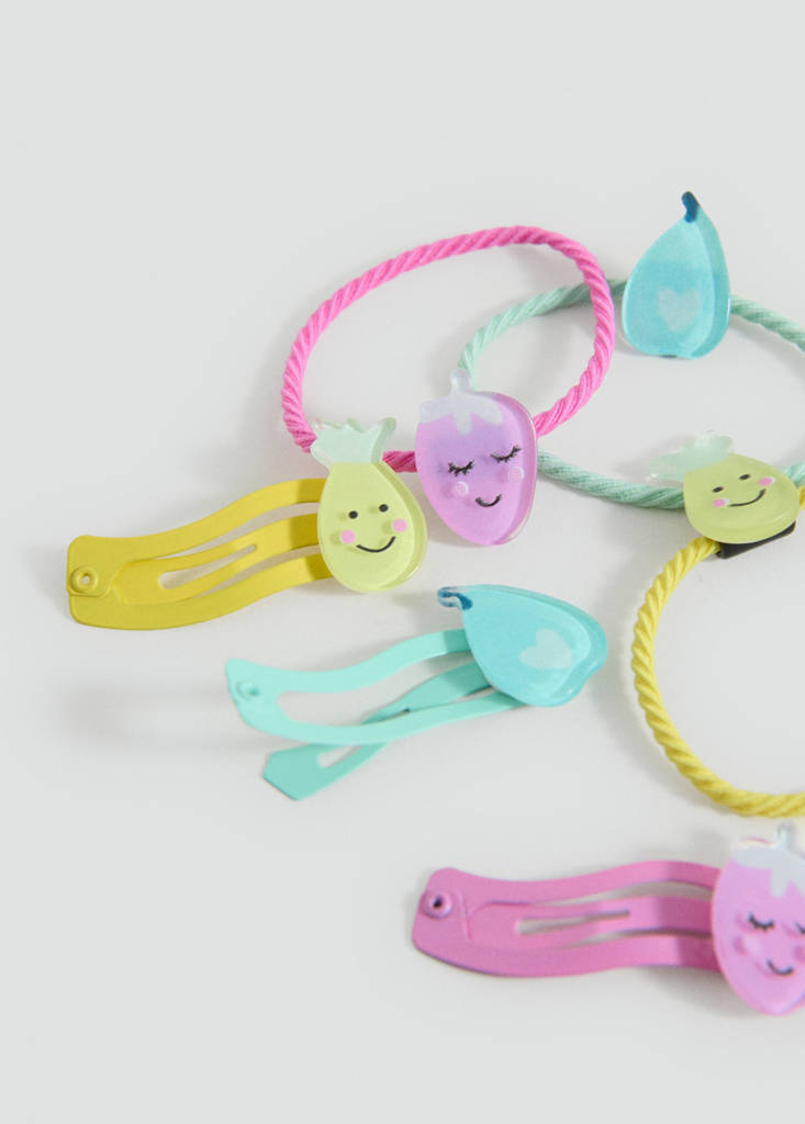 Pack of 6. Hair ties. Hair clip. Fruit design. Multicolor design