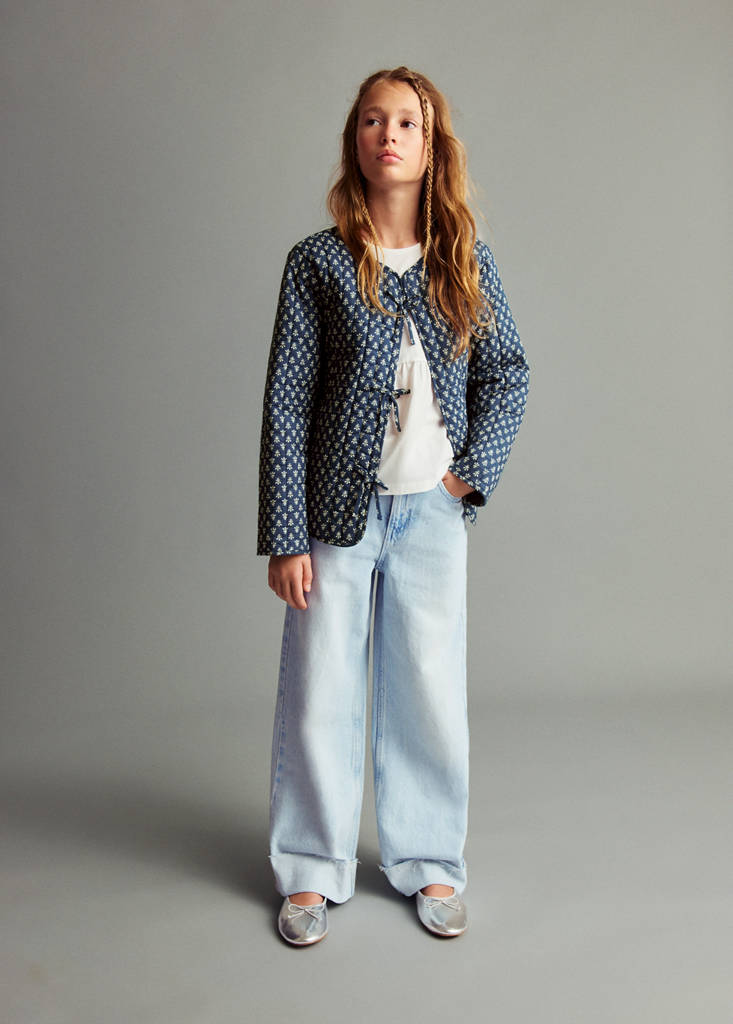 100% cotton fabric. Denim-style cotton fabric. Long design. Loops on the waist. Button and zipper fastening. Coin pocket. Two side pockets. Patch pockets on the back. Frayed hem. Rolled-up hem