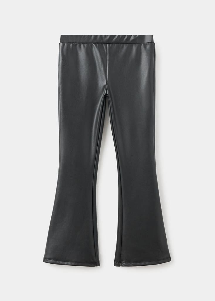 Leather-effect fabric. Long design. Flare design. Elastic waistband. Welt pocket on the back