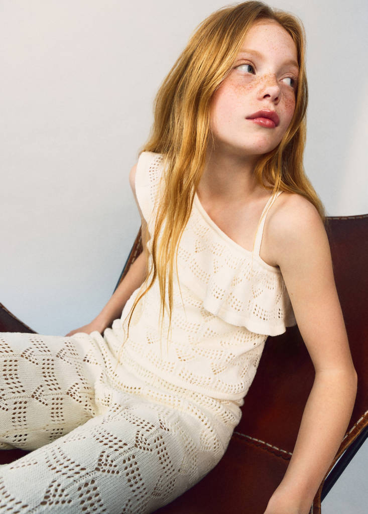 100% cotton fabric. Openwork knit. Straight design. Asymmetric design. Ruffles detail on the neck. Thin strap. Off shoulder. Total look
