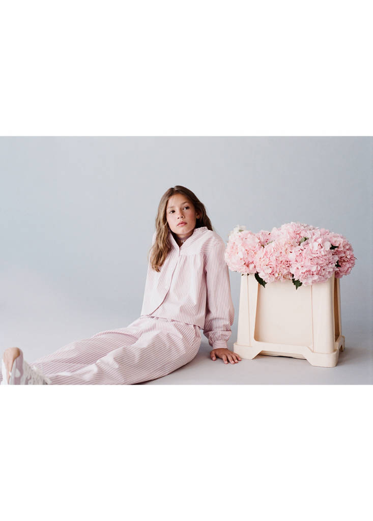 Crafted from 100% cotton fabric with stripes, this garment features an A-line design and a V-neck. The long sleeves have buttoned and gathered cuffs, as does the detail on the chest. The front button closure completes the total look.