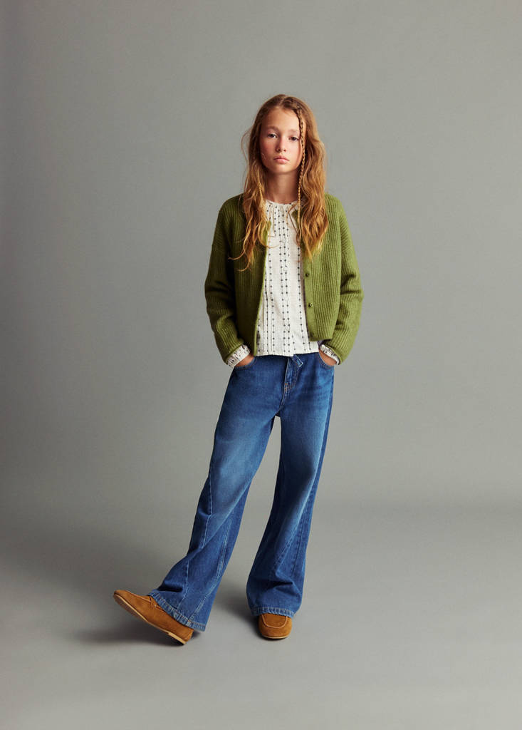 Knit fabric. Straight design. Round neck. Long sleeves. Front button closure. Back to school