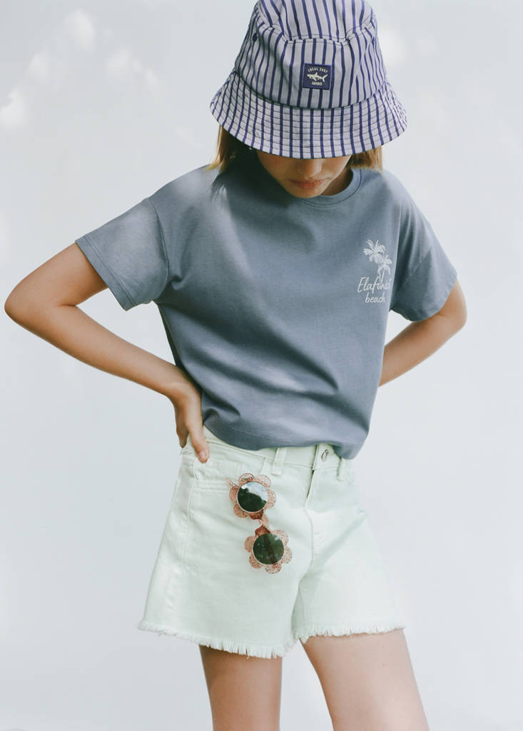 100% cotton fabric. Straight design. Short design. Palm tree print. Print on the front. Round neck. Short raglan sleeves. Printed design on the back
