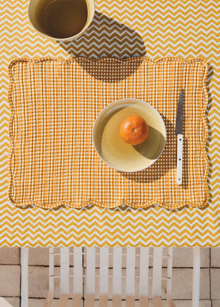 100% cotton fabric. Size: 35x50 cm. Quilted placemat with a rectangular design, geometric shapes, and wave effect. Reversible check and stripe design. Ideal for patios and outdoor dining