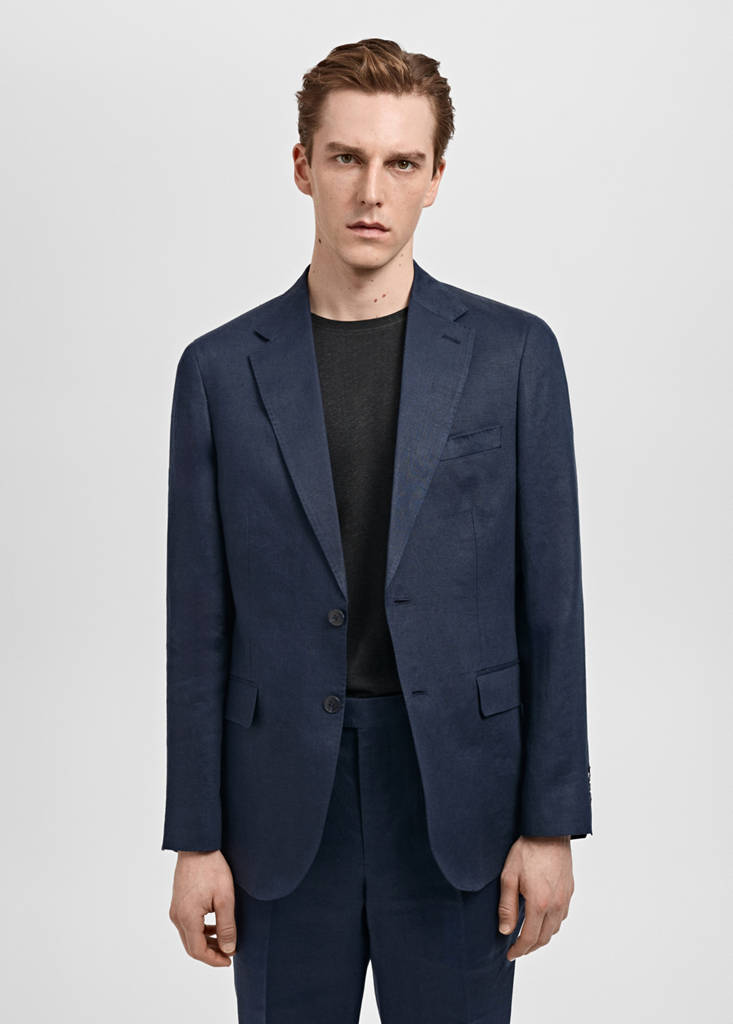 Slim fit. 100% Linen. Notch lapels and buttonhole. Chest welt pocket. Two flap pockets on the front. Long sleeves with buttoned cuffs. Inner lining. Interior pockets. Tailoring collection. Promotional product