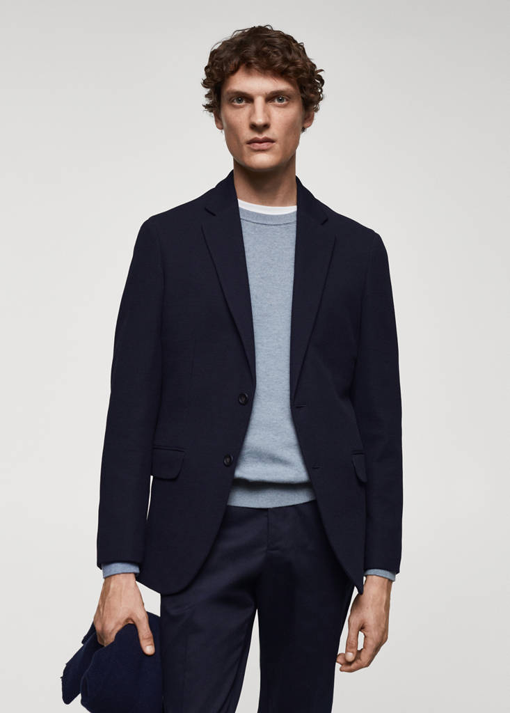 The color black is exclusive online. Slim fit. Cotton fabric. Cotton twill structure. Lightweight fabric. Notched lapel collar. Two patch pockets on the front. Long sleeves with buttoned cuffs. Straight hem. Double back slit. Interior pocket with button closure. Inner lining at the front. Front button closure