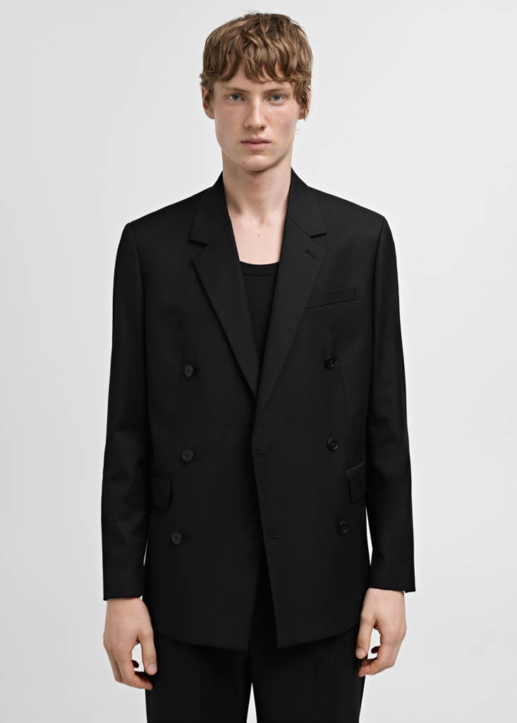 Regular fit. Crossed design. Notch lapels and buttonhole. Front closure with crossed buttons. Chest welt pocket. Two pockets with flaps on the front. Double back slit. Button closure. Inner lining. Interior pocket. Tailoring collection. Antoine Griezmann Campaign. Long buttoned sleeves