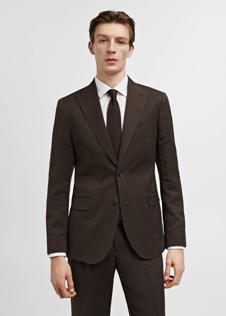 Slim fit. Cotton and linen blend fabric. Notch lapels and buttonhole. Chest welt pocket. Two flap pockets on the front. Long sleeves with buttoned strip cuffs. Inner lining. Two welt pockets inside. Tailoring collection. Front button closure