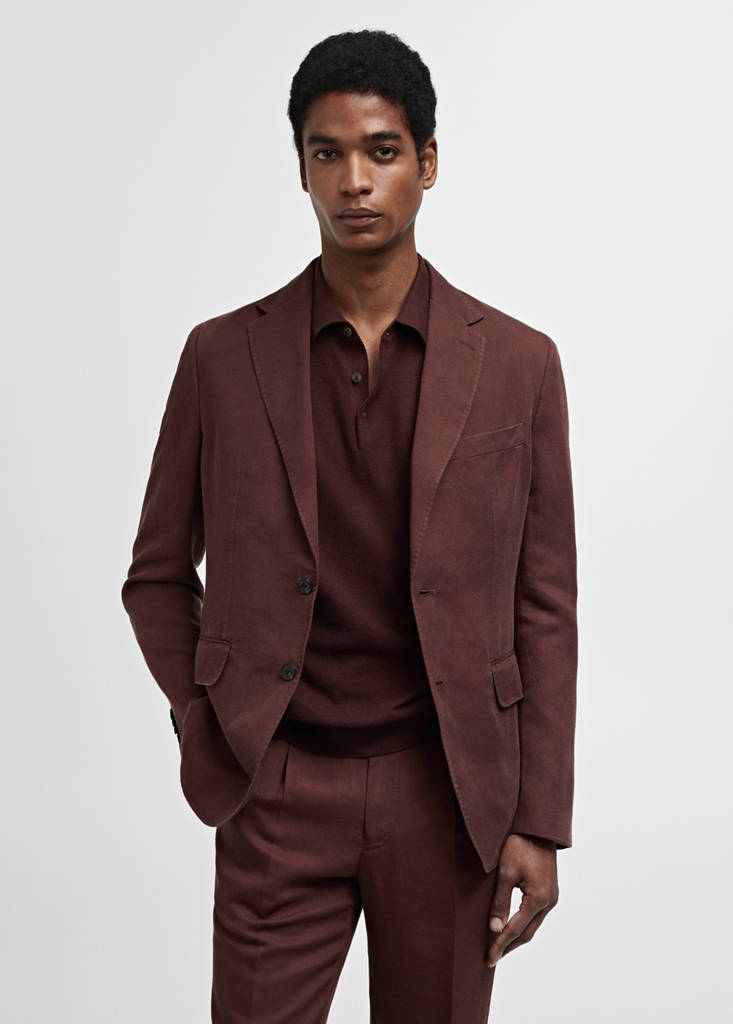 Slim fit. Linen blend fabric. Delavé linen fabric. Notch lapels and buttonhole. Chest welt pocket. Two flap pockets on the front. Long sleeves with buttoned strip cuffs. Two welt pockets inside. Inner lining. Tailoring collection. Double back vent at the hem. Front button closure