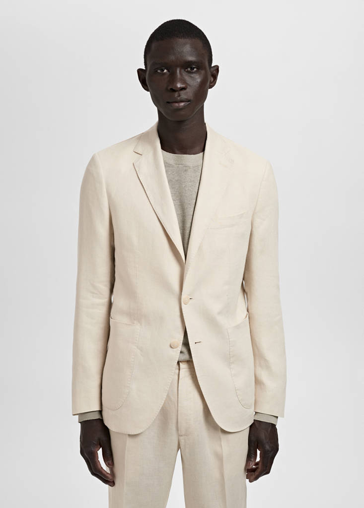 Slim fit. 100% linen fabric. Tailoring collection. Notch lapels and buttonhole. Chest welt pocket. Button closure. Two side patch pockets. Buttoned cuff straps