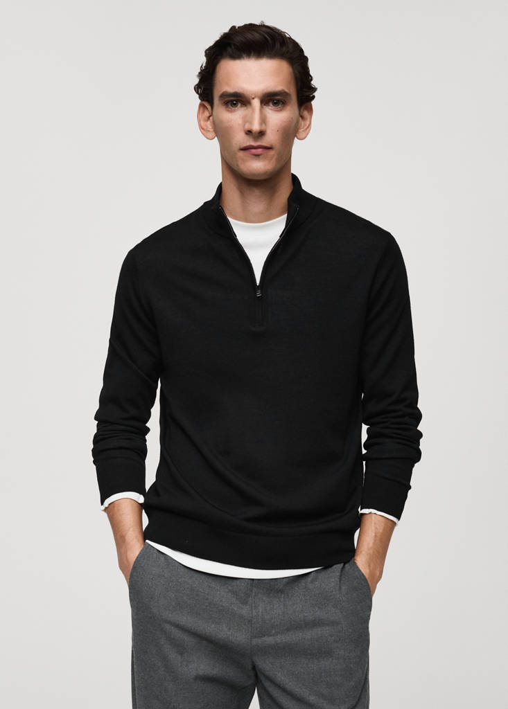 ESSENTIALS: Made to last. The beige color is an online exclusive. 100% merino wool. Machine washable. Fine knit fabric. Perkins collar with zipper closure. Cable knit finish. 100% wool. The colors green and camel are online exclusives. Medium-knit fabric. Long sleeves with elastic cuffs. Untrimmed hem. Regular fit