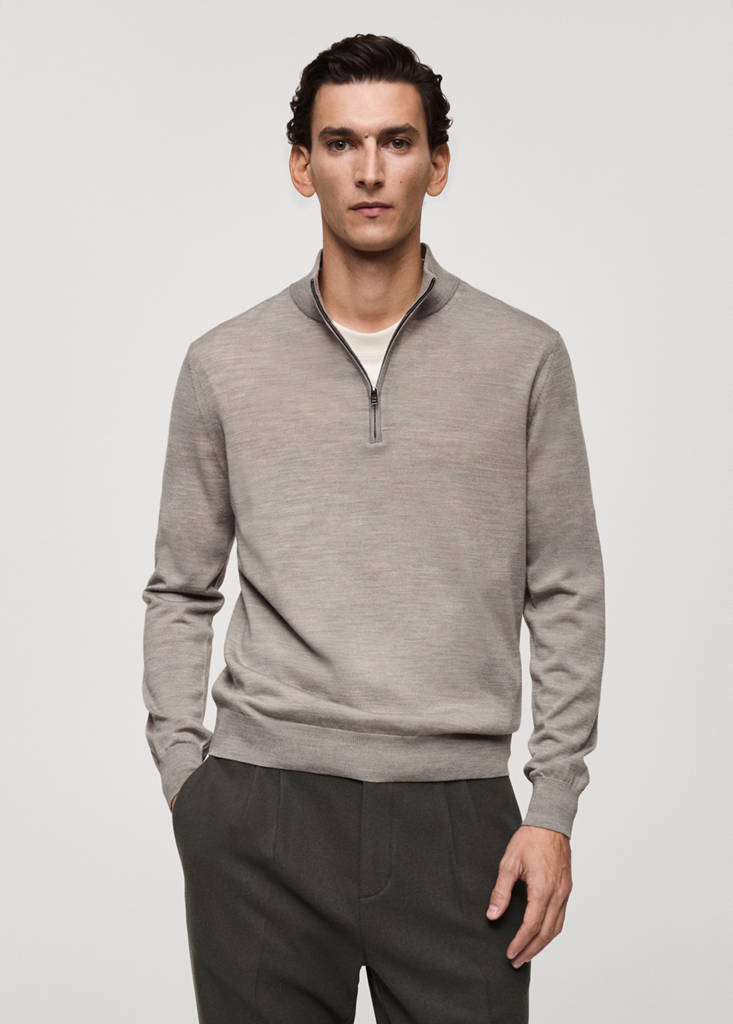 ESSENTIALS: Made to last. The beige color is an online exclusive. 100% merino wool. Machine washable. Fine knit fabric. Perkins collar with zipper closure. Cable knit finish. 100% wool. The colors green and camel are online exclusives. Medium-knit fabric. Long sleeves with elastic cuffs. Untrimmed hem. Regular fit