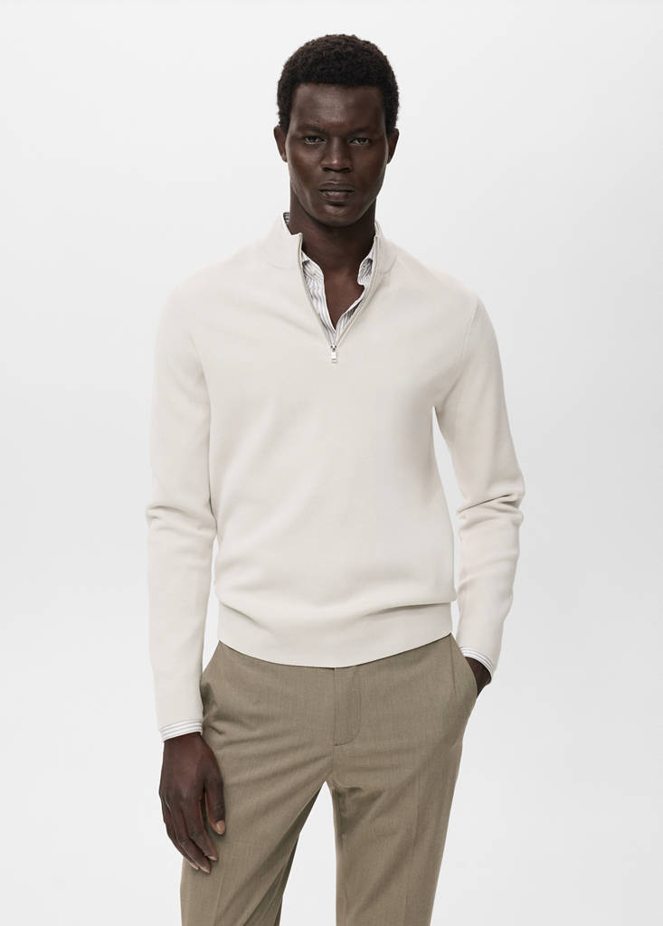 Fine knit fabric. Regular fit. Perkins collar with zipper closure. Ribbed finish on neckline, sleeves, and hem