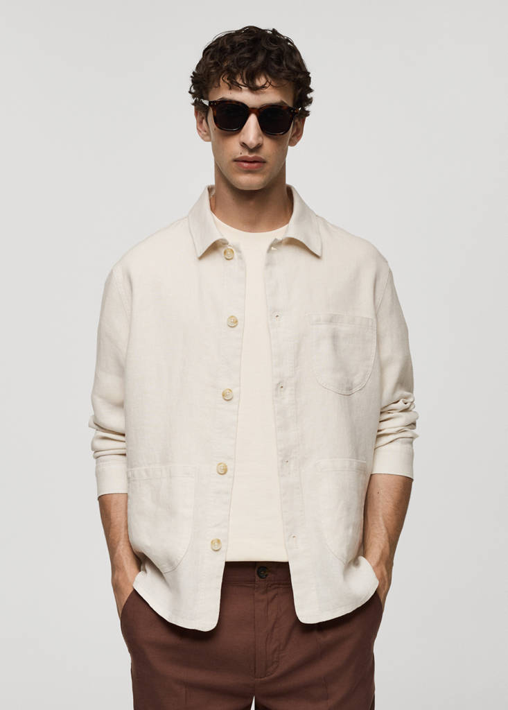 100% linen fabric. Shirt collar. Button closure at the front. Patch pocket on the chest. Two patch pockets on the front. Long sleeves with buttoned cuffs. Straight hem