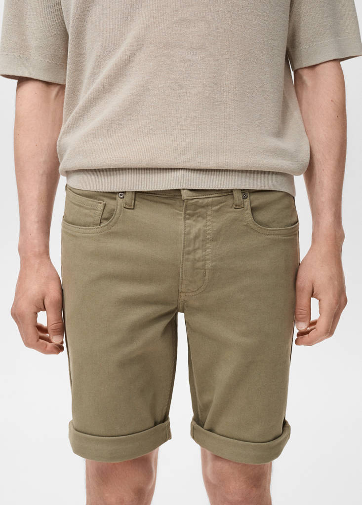Crafted from cotton fabric, these slim-fit bermuda shorts feature belt loops and a button and zipper fastening. They include two side pockets, a coin pocket, and two patch pockets at the back. The bermuda shorts have a hem at the bottom. The model is 190 cm tall and is wearing a size 42