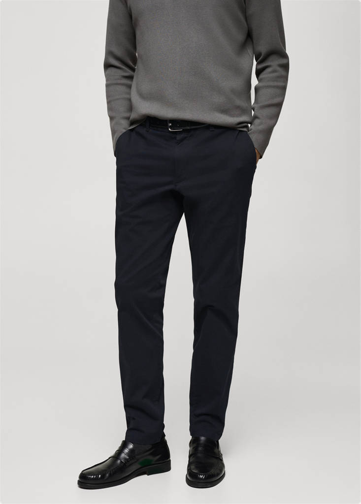 Cotton blend fabric. Chinos style. Slim fit. Zip and button closure. Belt loops. Five pockets. Two side pockets. Two welt pockets at the back