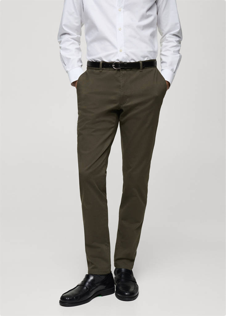 Cotton blend fabric. Chinos style. Slim fit. Zip and button closure. Belt loops. Five pockets. Two side pockets. Two welt pockets at the back
