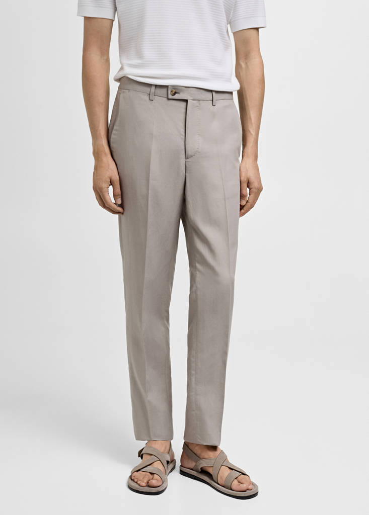 Slim fit. Mid-rise. Belt loops. Button, hook and zipper closure. Front pleat detail. Two front pockets. Welt pocket with button on the back. Tailoring collection. Lyocell, cotton, and linen blend fabric. Pressed crease detail on the front and back