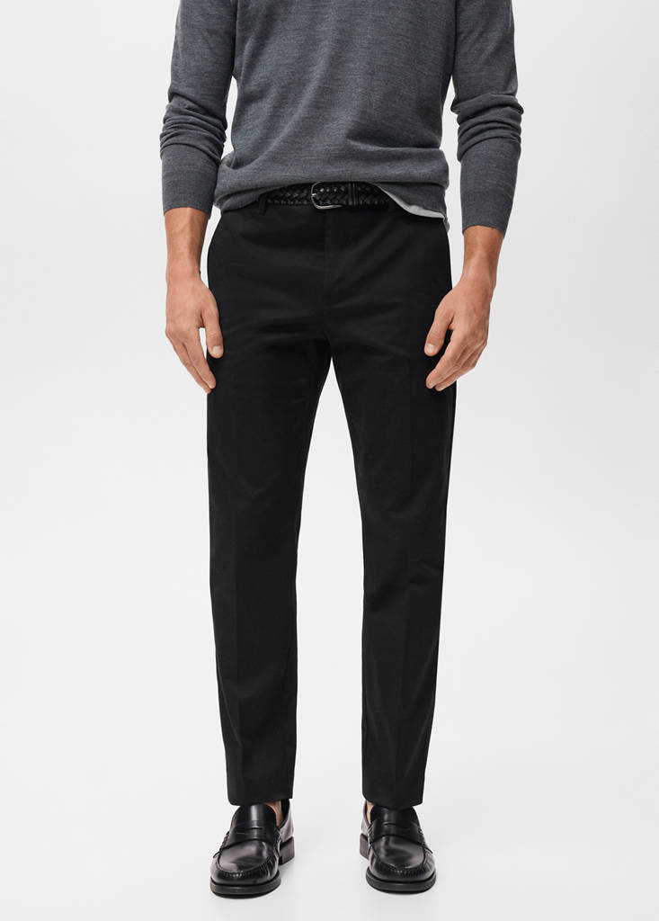 Cotton fabric. Regular fit. Pressed crease detail on the front and back. Front zip and button closure. Belt loops. Two side pockets. Two welt pockets with button at the back