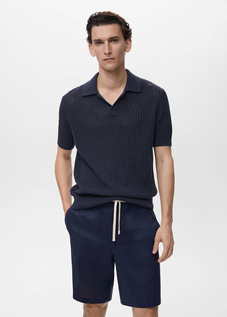 Openwork knit. Cotton fabric. Short sleeves. Ribbed neck, cuffs and hem