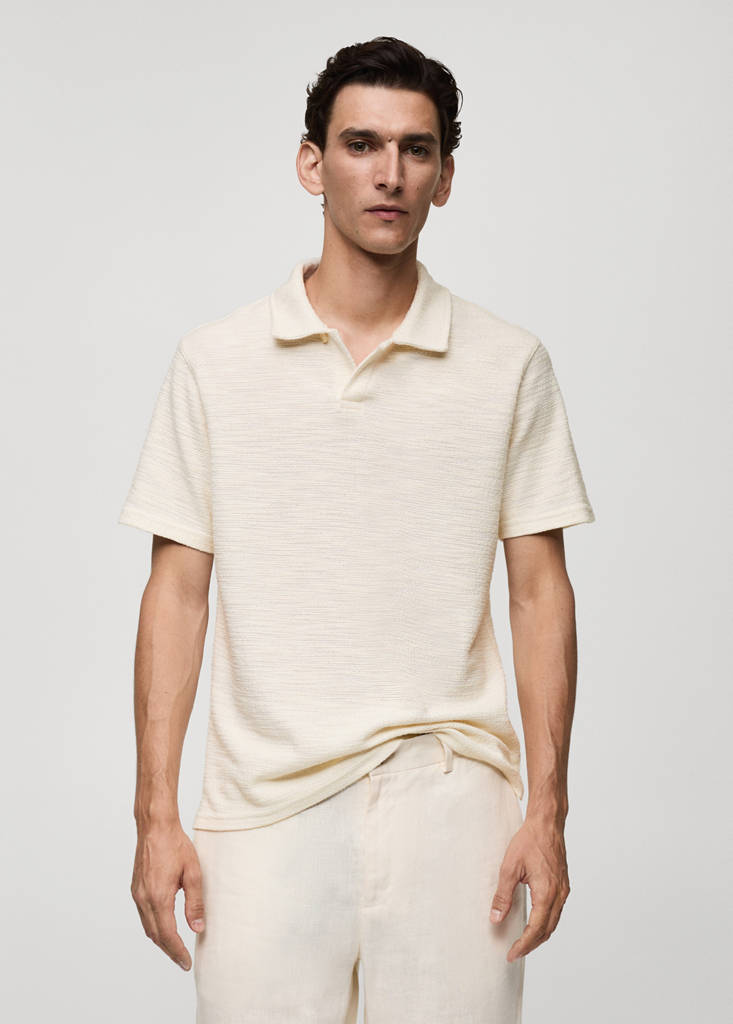 Set available as total look. Regular fit. Cotton blend fabric. Textured fabric. Horizontal structure of irregular yarn. Short sleeves. Straight hem. Polo collar with one button closure. Fabric with striped texture. Polo-neck with interior button closure
