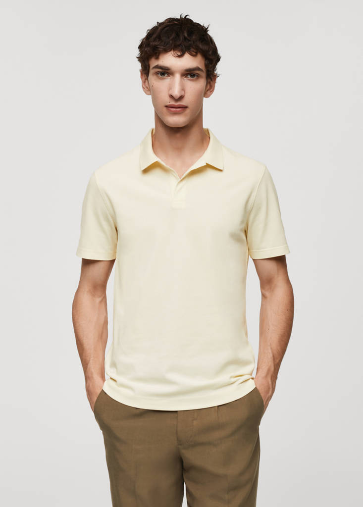 Slim fit. Cotton piquet fabric. V-neck polo collar without closure. Cable knit collar. Short sleeves. Straight hem with stitched details. The dark navy blue model is an online exclusive