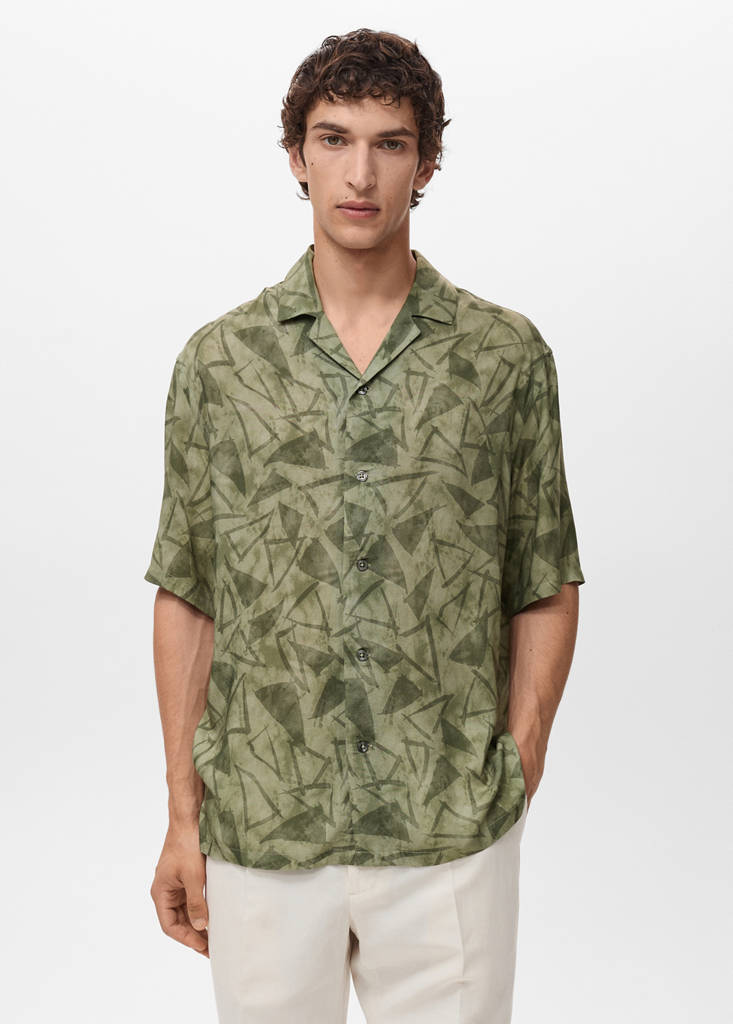 Modal fabric. Bowling collar. Geometric print. Short sleeves. Fluid fabric