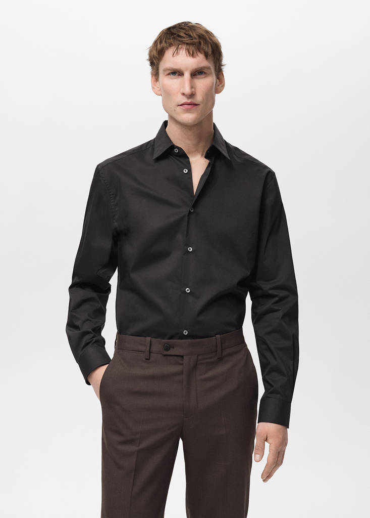 Regular fit. Slightly elastic cotton fabric. Classic collar. Front button closure. Long sleeves with buttoned cuffs. Rounded hem
