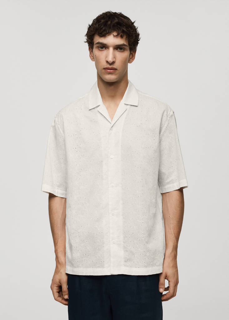 Relaxed fit. Shirt collar. Bowling collar. Short sleeves. Straight hem. Embroidered design. 100% cotton fabric. Front button closure