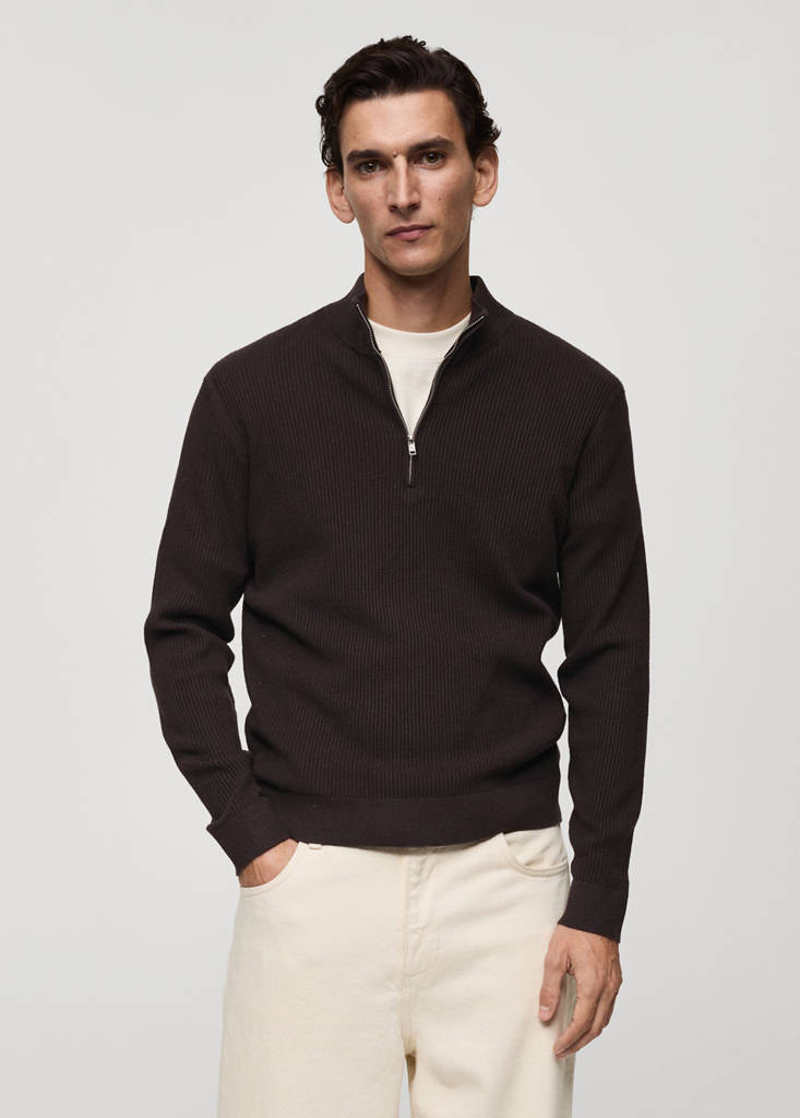 The chocolate brown color is online exclusive. Regular fit. Cotton blend fabric. Fine knit fabric. Rib knit fabric. Perkins collar with zipper closure. The white and asphalt gray models are online exclusives. Cotton and polyester blend fabric. Braided ribbed structure. Untrimmed hem