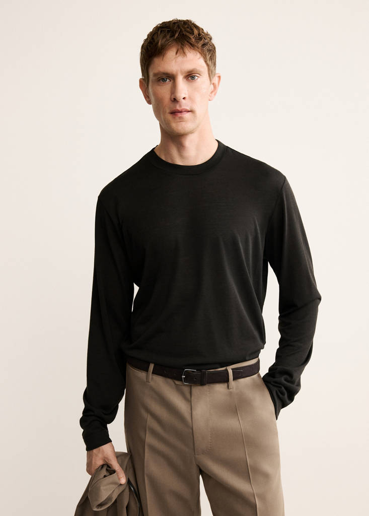 Slim fit. Wool mix fabric. Fitted design. Round neck. Long sleeves. No closure
