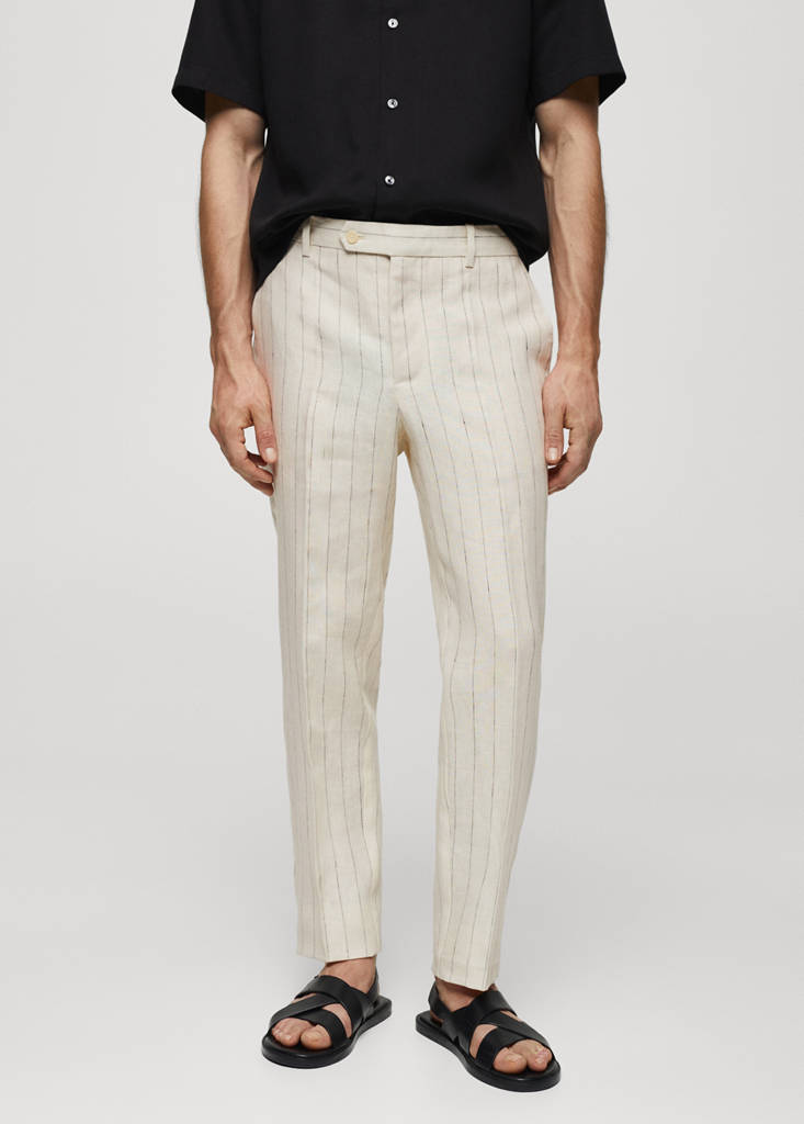 Slim-fit pinstripe pantsCurrent price [US$ 89.99 ]US$ 89.99Select a colourOff WhiteThe model is wearing size 32 (EUR 42) and is 6'2" tall.Select your size30 (EUR 38)Not available. I want it!31 (EUR 40)Not available. I want it!32 (EUR 42)Not available. I want it!34 (EUR 44)Not available. I want it!36 (EUR 46)Not available. I want it!DimensionsNotify meAdd to WishlistSee lookFree shipping to storeSlim fit. Belt loops. Concealed button, hook and zip fastening. Pinstripe pattern. Two front pockets. Two welt pockets with button at the backDetails, composition and careStore availabilityMango StylistAsk about deliveries, returns and moreAssistant