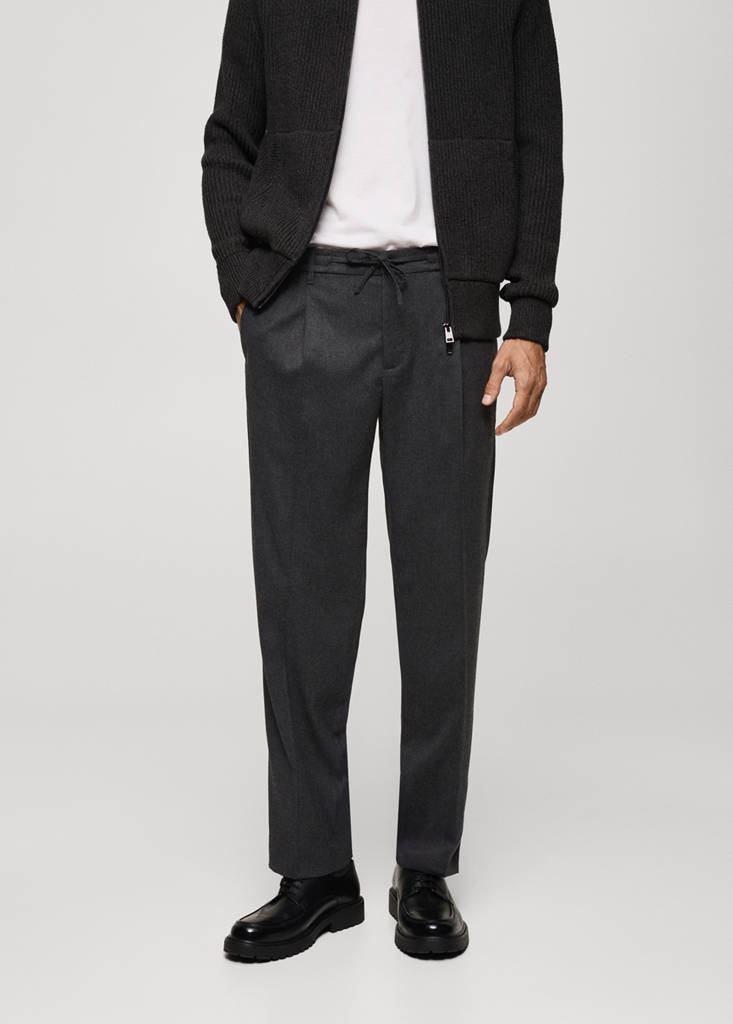 Regular fit. Mid-rise. Flannel fabric. Front pleat detail. Elastic waistband with adjustable drawstring. Button closure. Pressed crease detail on the front and back