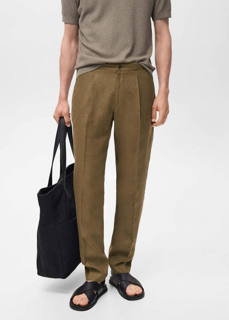 Slim fit. 100% linen fabric. Tailoring collection. Elastic waist at the back. Button and zipper fastening. Two side pockets. Front pleat detail. Two welt pockets with button at the back