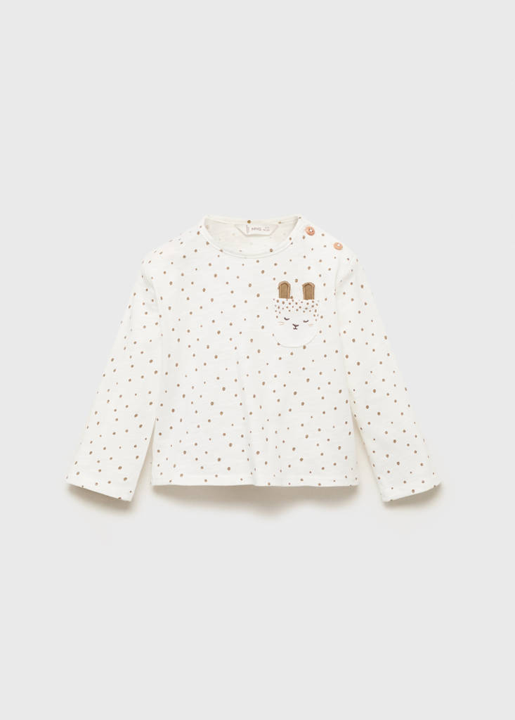 Crafted from 100% cotton fabric, this t-shirt features a straight design with a kitten print. It has a round neck with a button closure, long sleeves, an embroidered detail, and a chest pocket