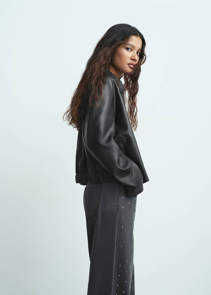 Leather-effect fabric. Straight design. Lapel collar. Long sleeves. Front zipper closure. Two side pockets. Party and events collection. Party Collection. Christmas Collection. Glossy design