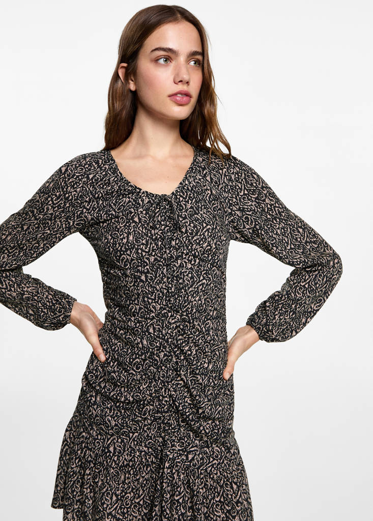 Fluid fabric. Printed design. Short design. A-line design. Central gathered section detail. Ruffle hem