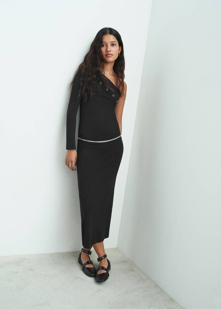Cotton fabric. Stretch fabric. Long design. Asymmetric neckline. Studded detail. A sleeve