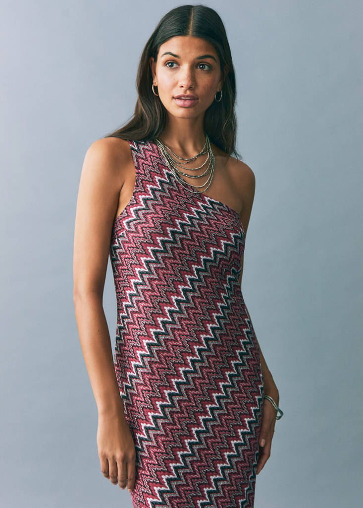 Fine knit fabric. Fabric with metallic thread. Zig-zag structure. Slim Silhouette. Asymmetric design. Long design. Asymmetric neckline. Wide strap. Inner lining