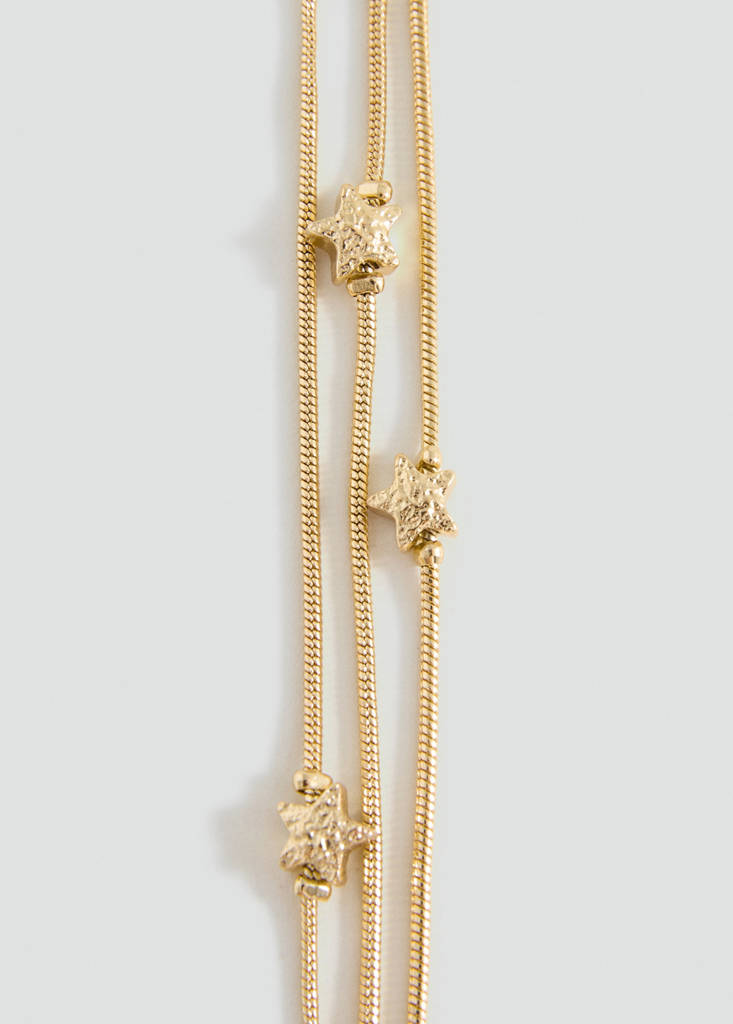 Star tassel braceletCurrent price [US$ 19.99 ]US$ 19.99Select a colourGoldSelect your sizeOne sizeNot available. I want it!Notify meAdd to WishlistSee lookFree shipping to storeMetallic design. Stars details. Multi-chain. Hook closureDetails, composition and careStore availabilityMango StylistAsk about deliveries, returns and moreAssistant