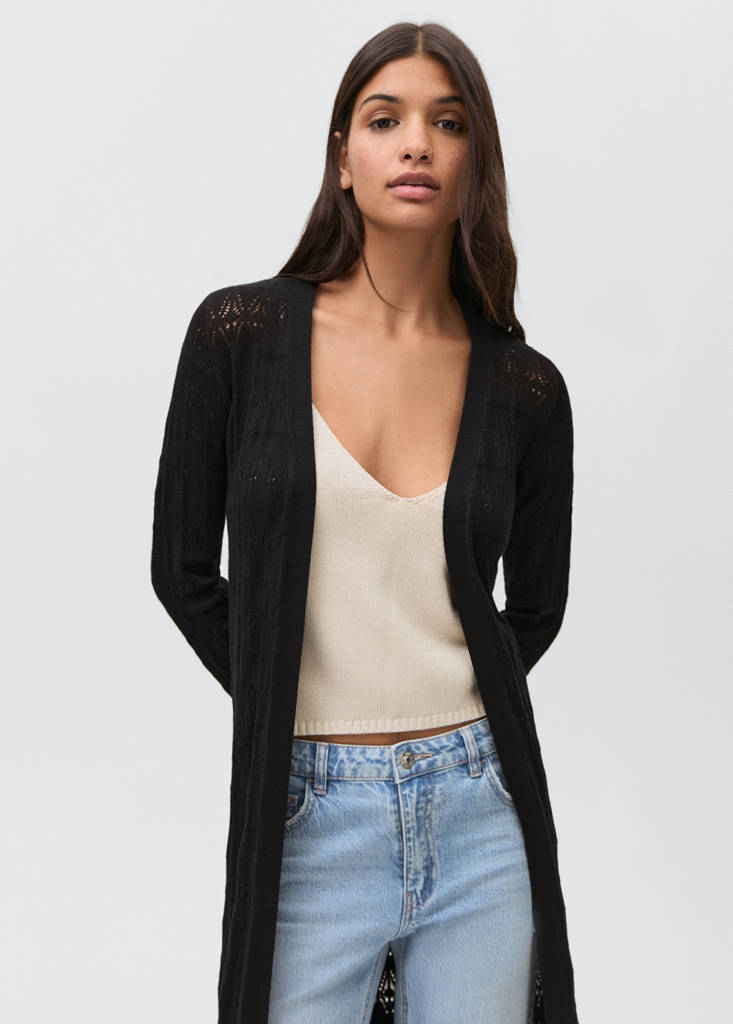 Openwork knit. Long design. Open neck. Front opening. Scalloped edges