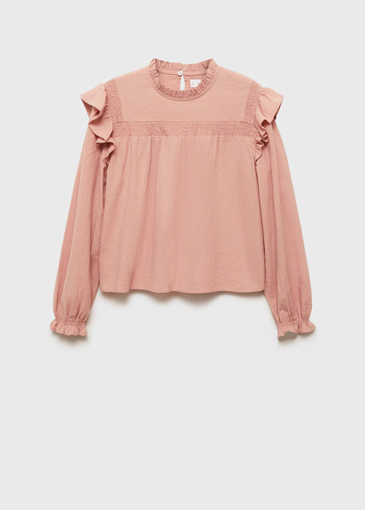 100% Cotton. Flowy textured fabric. Long sleeves. Round neck with ruffles. Ruched panel. Ruffles on the shoulders. Pleats detail. Ruffles on the cuffs. Button closing on the neck