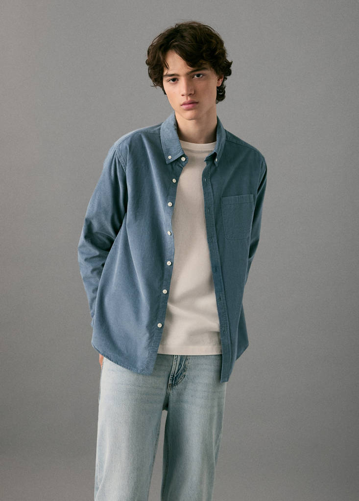 100% cotton fabric. Corduroy fabric. Straight design. Shirt collar. Long sleeves with buttoned cuffs. Front button closure. Front patch pocket