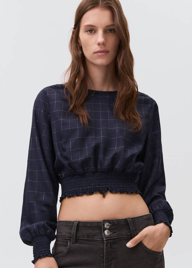 Crafted from check fabric with lurex, this blouse features a fluid and straight design. The round neckline and long sleeves with elasticated cuffs complement the elasticated gathering at the waist. Button fastening at the back.