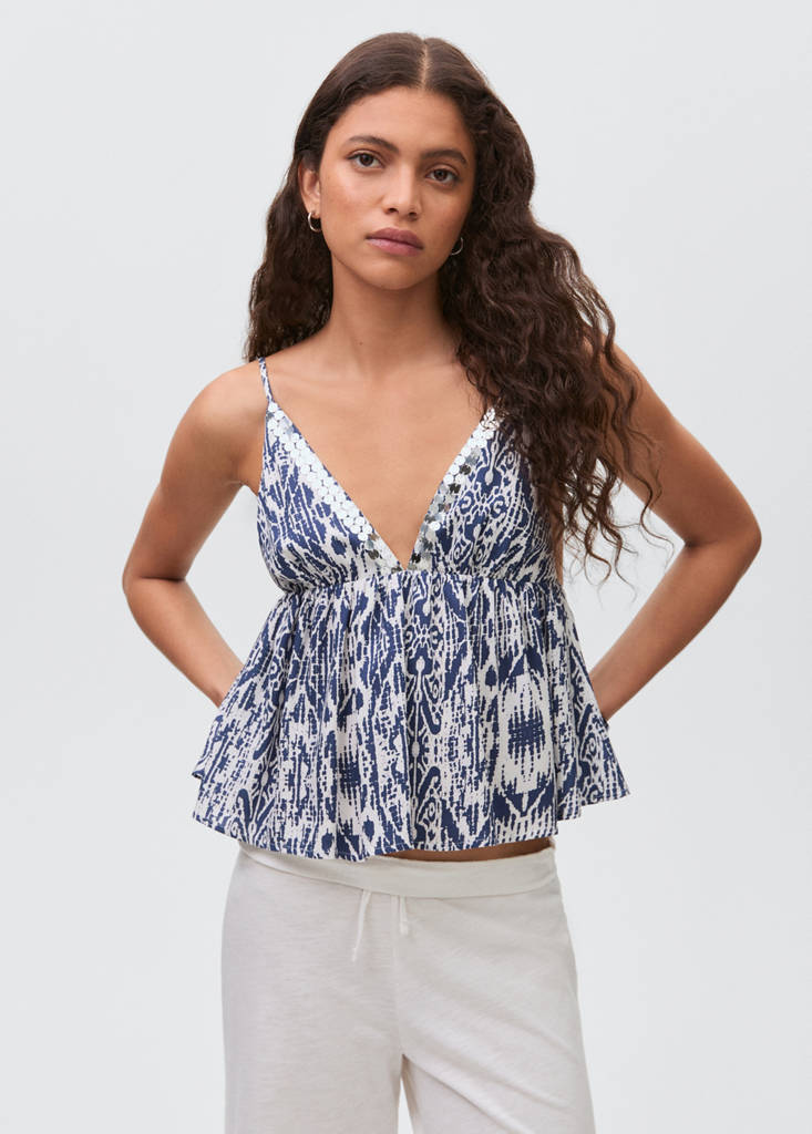 Viscose fabric. Printed design. A-line design. Sequin detail. V-neck. Thin straps. Open back. Tie closure at the back
